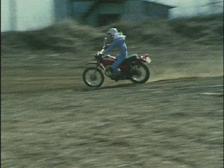 ここはマニアにはオープニングのサイクロンのシーンをはじめ多くのバイクスタントシーンが撮られたトミナガオートランドの名で知られるダートコース場の道を隔てて向かい側にあたり、HPの学校沿革によると47年開校とあるので46年撮影のこの頃から工事が始まっているだろうから映像に映るプレハブ小屋のようなものはおそらく学校工事の現場事務所なのだろう。