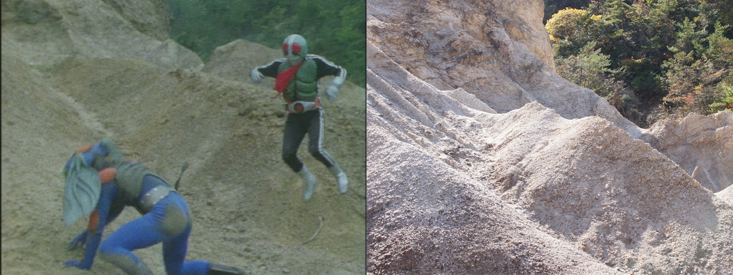 藤兵衛たちが囚われているカットからこのシークエンスのもう一つのロケ地、蓬莱峡から2kmほど離れた白水峡へ移るが岩本博士奪還の絡みはそのままこの河川敷。決戦でライダーとアブゴメスの絡みは実に1カットだけ巧みに両方の場所が使われている。似たような砂防堰堤が存在し、観ていても場所が切り替わったのに気づかないほどだ。
