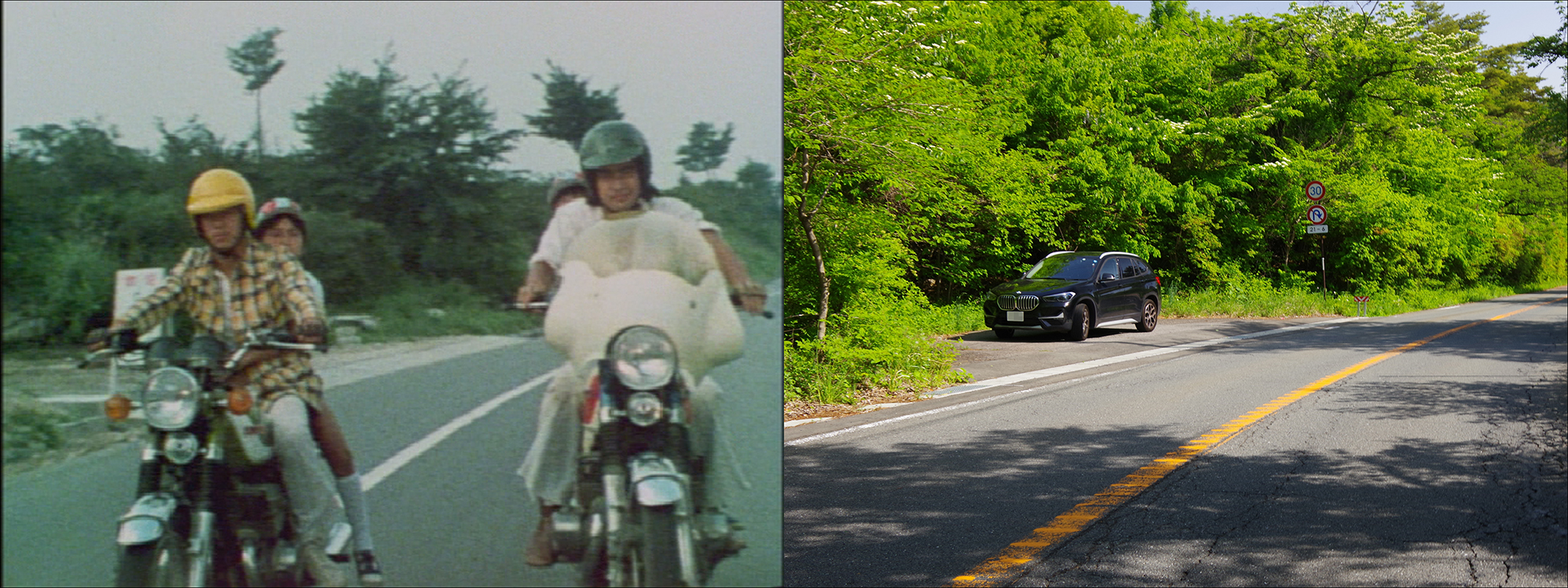 サイクリングのグループが自転車を停めていたのは稲城市大丸の大丸用水堰。2019年の台風災害により大きく被害を受けた事をきっかけに大掛かりな河川敷の改修工事が行われており立ち入りが出来なくなっている。対比は2019〜20年にかけて撮影した画像で大きくえぐり取られた様子を捉えている。